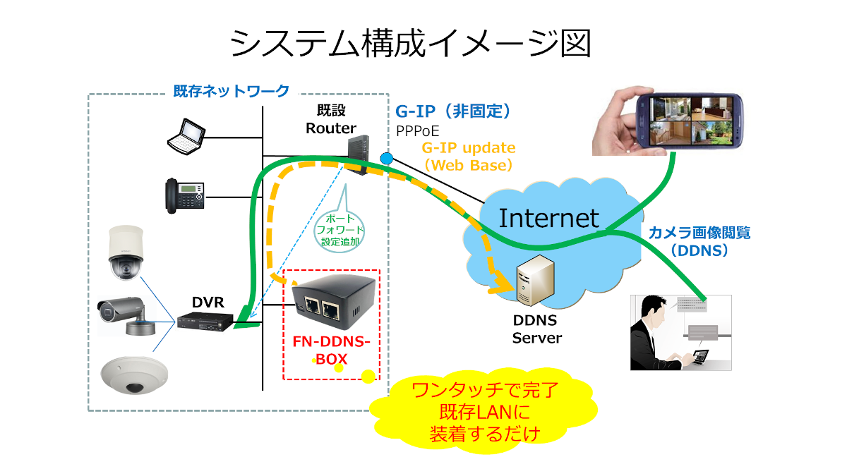 例えば、カメラ録画システムを取り付ける際に、既存の環境のルータ機器を交換する等で作業リスクや作業時間が長い等が大きな負担が伴いますが、FN-DDNS-BOX機器は既設の環境に取り付けるだけですので、大きな作業負担の軽減になります。