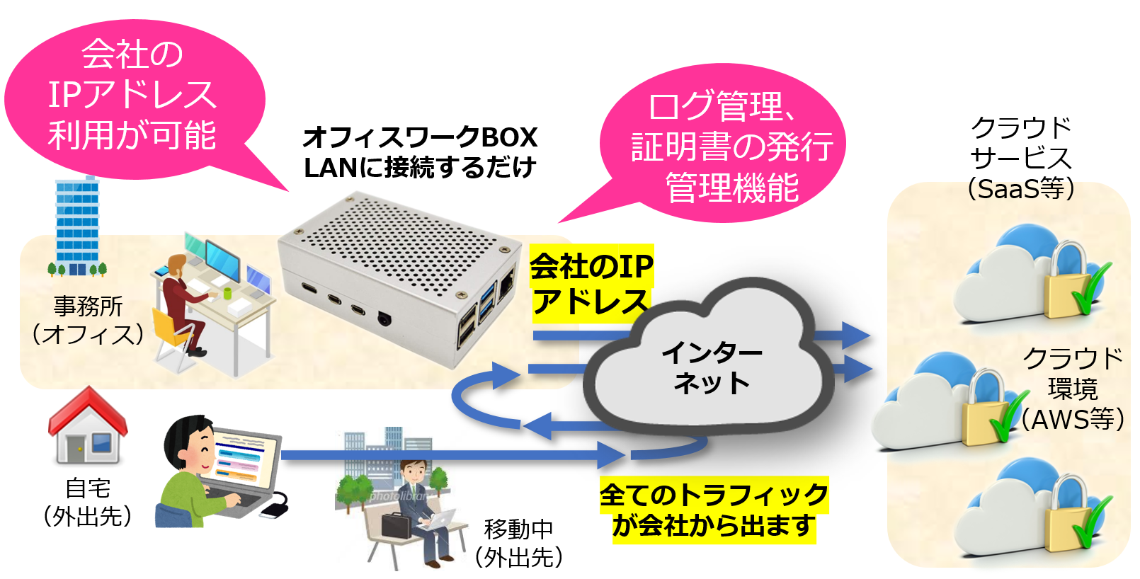 「オフィスワークBOX」は、テレワーク環境の全てのインターネットトラフィックを会社側に流すことができるため、会社に設置されたルータやUTMからインターネットに出ることができます(オフィスブレイクアウト機能) そのため、会社の統一したセキュリティ基準をテレワークユーザに適用することが可能となります。 またテレワーク環境から会社のインターネット回線を使って出ることができるため、会社のグローバルIPアドレスでセキュリティ制限をされているような外部サイト(SaaS等)へのアクセスが可能になります。